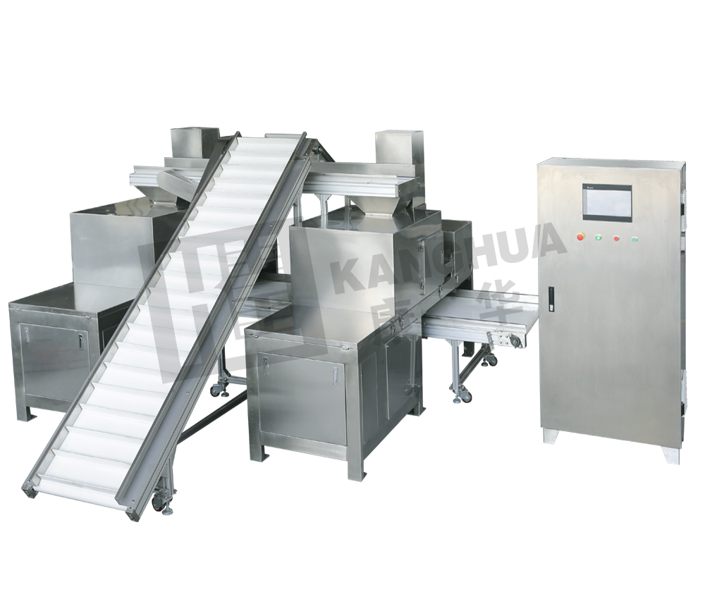 將兩臺單獨的刨片機組合,實現(xiàn)上料,分流,稱重,切制,出料全自動的生產過程。進料端設有輸送式儲料箱,可以儲存較大量原物料,減少人工加料次數。運行全程由PLC微電腦控制操作,具有連續(xù)作業(yè)、能耗低、產量高等優(yōu)點。符合GMP要求。